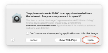 2) After downloading, double-click on downloaded file (it's name is "happiness-at-work-2020-Mac-2.dmg"). You will see app folder: