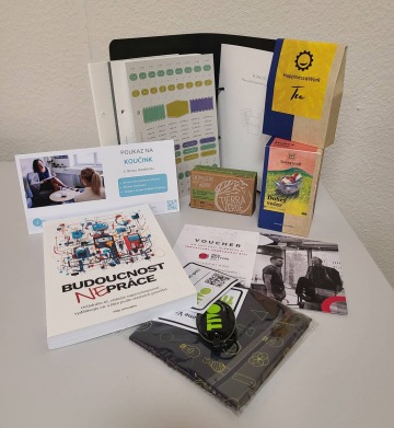 Plánovací diář Planoo od Papelote, čajíky od Sonnetoru, mýdlo od Tierra Verde, poukaz na Red Button EDU předplatné, poukaz na koučink, kniha Budoucnost nepráce, funkční šátek a lampička na klíče od Tivo