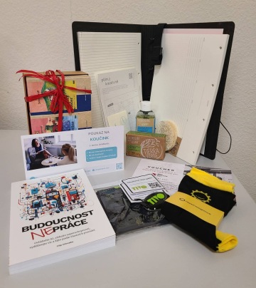 Nový start plánovací set od Papelote, čajový balíček od Sonnetor, balíček od Tierra Verde, poukaz na Red Button EDU předplatné, poukaz na koučink, funkční šátek a lampička na klíče od Tivo, kniha Budoucnost nepráce, Happy ponožky